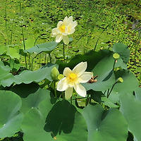 연꽃 잎 위에 개구리가 한마리 뛰어다니네요.